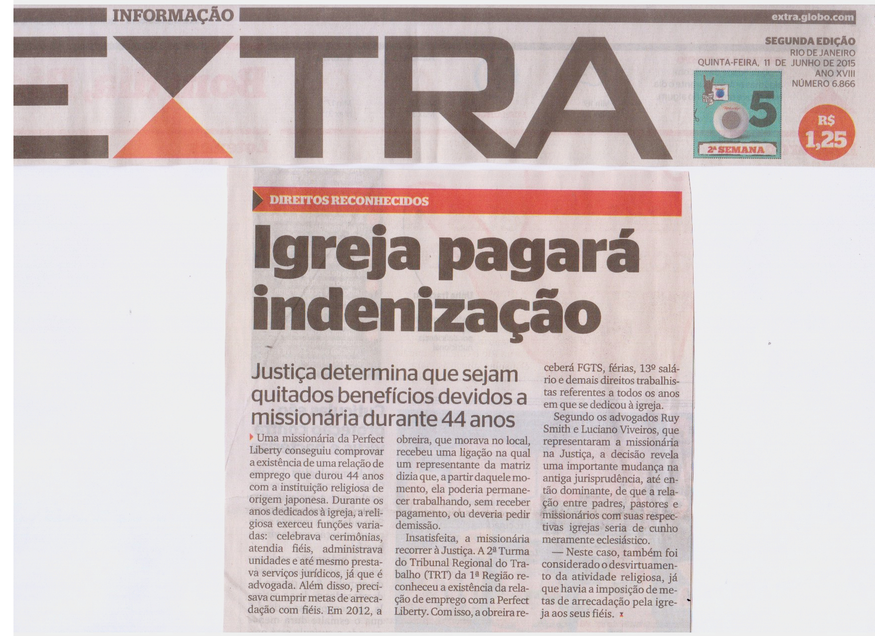 Igreja pagará indenização - 11/06/2015