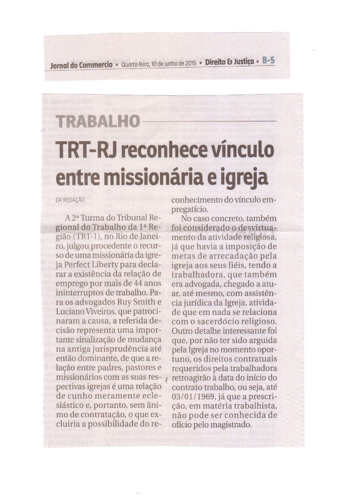TRT-RJ reconhece vínculo entre missionária e igreja - 10/06/2015